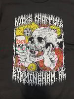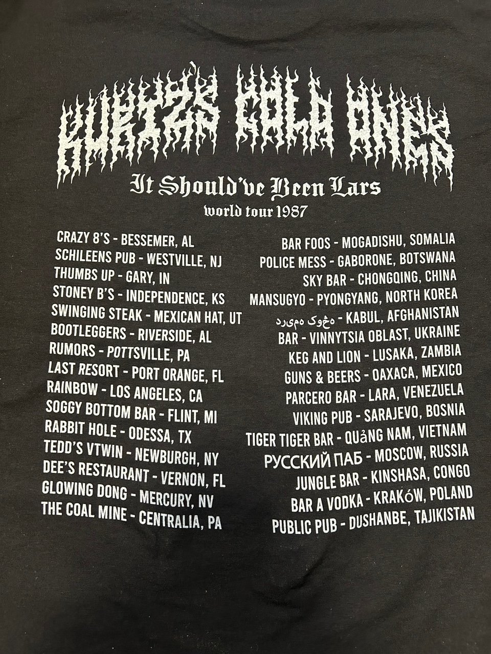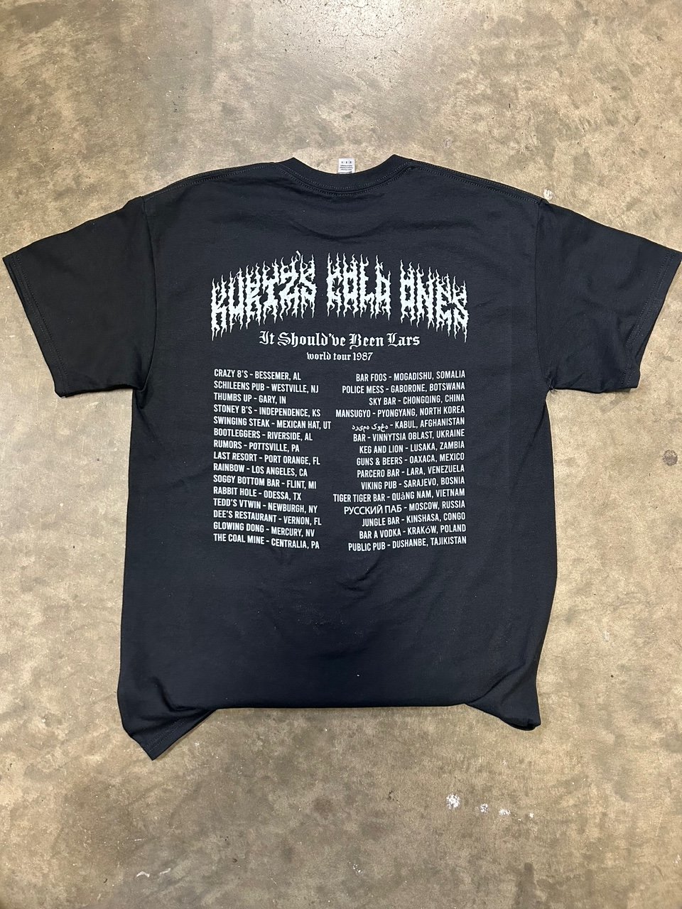 Nick's Choppers and Kurtz's Cold Ones ripped off a Pushead graphic to bring you this badass shirt. This original drawing was for "Shortest Straw", which is on Justice, which is the first record that Cliff Burton wasn't on. We toured to the worst best bars in the world, now you get to be part of the experience.