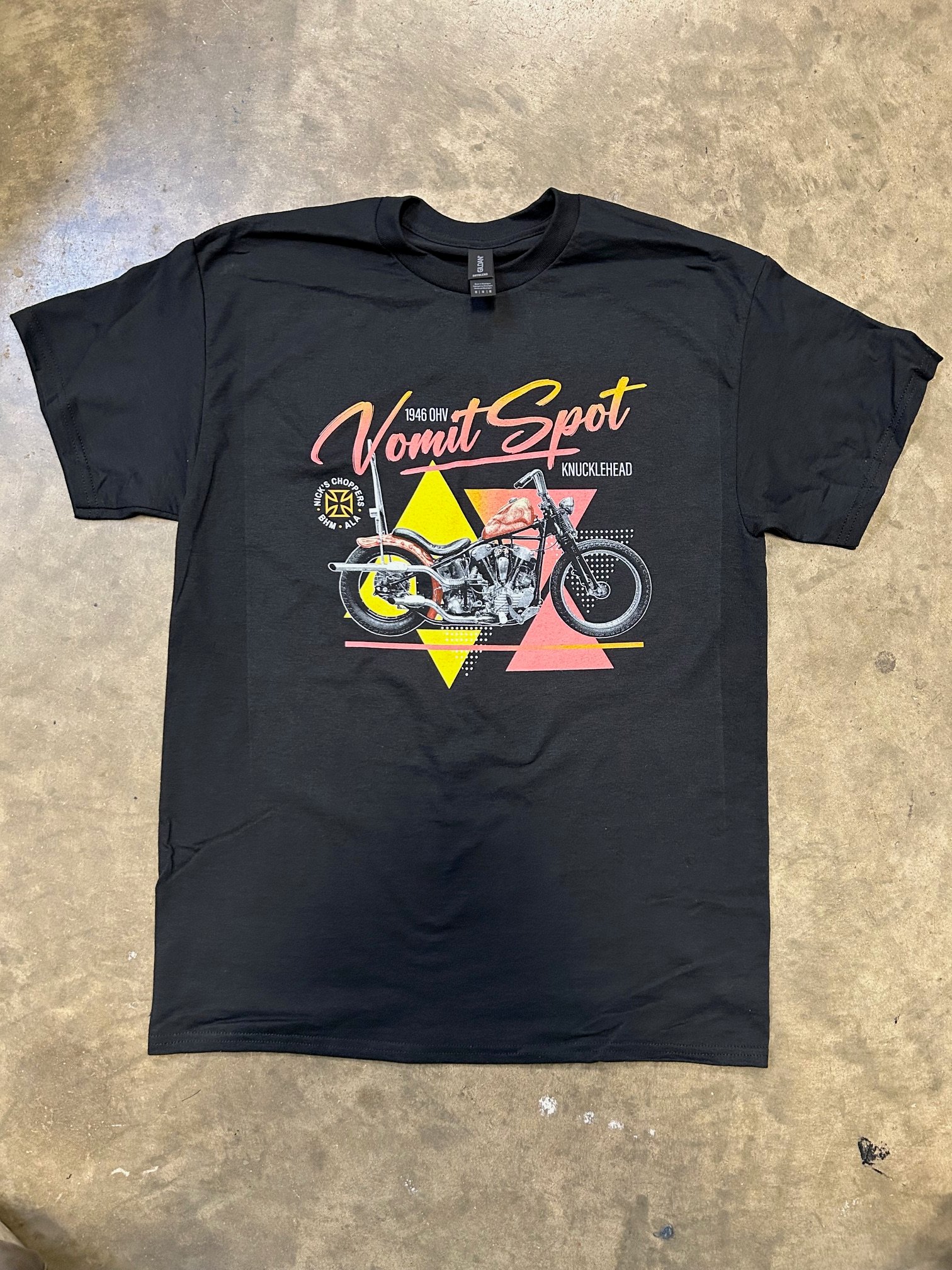 The paint on this bike kinda looks like puke and there was an Alabama punk band called the Vomit Spots, so there you have it. A bitchin' front only print on the same great fitting shirts that I always use.